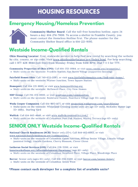 FDA manages Franklinton.org and Hilltopusa.org, community resource guides, to connect residents to resources and events. The goal is to inform, involve, and connect community members to aid and resources on the westside. Do you need printer friendly copies of what you can find on the resource guides? Visit our Google Drive Folder of downloadable PDFs of resources in English and Spanish. Below are the categories that we have created as PDFs. Examples below.